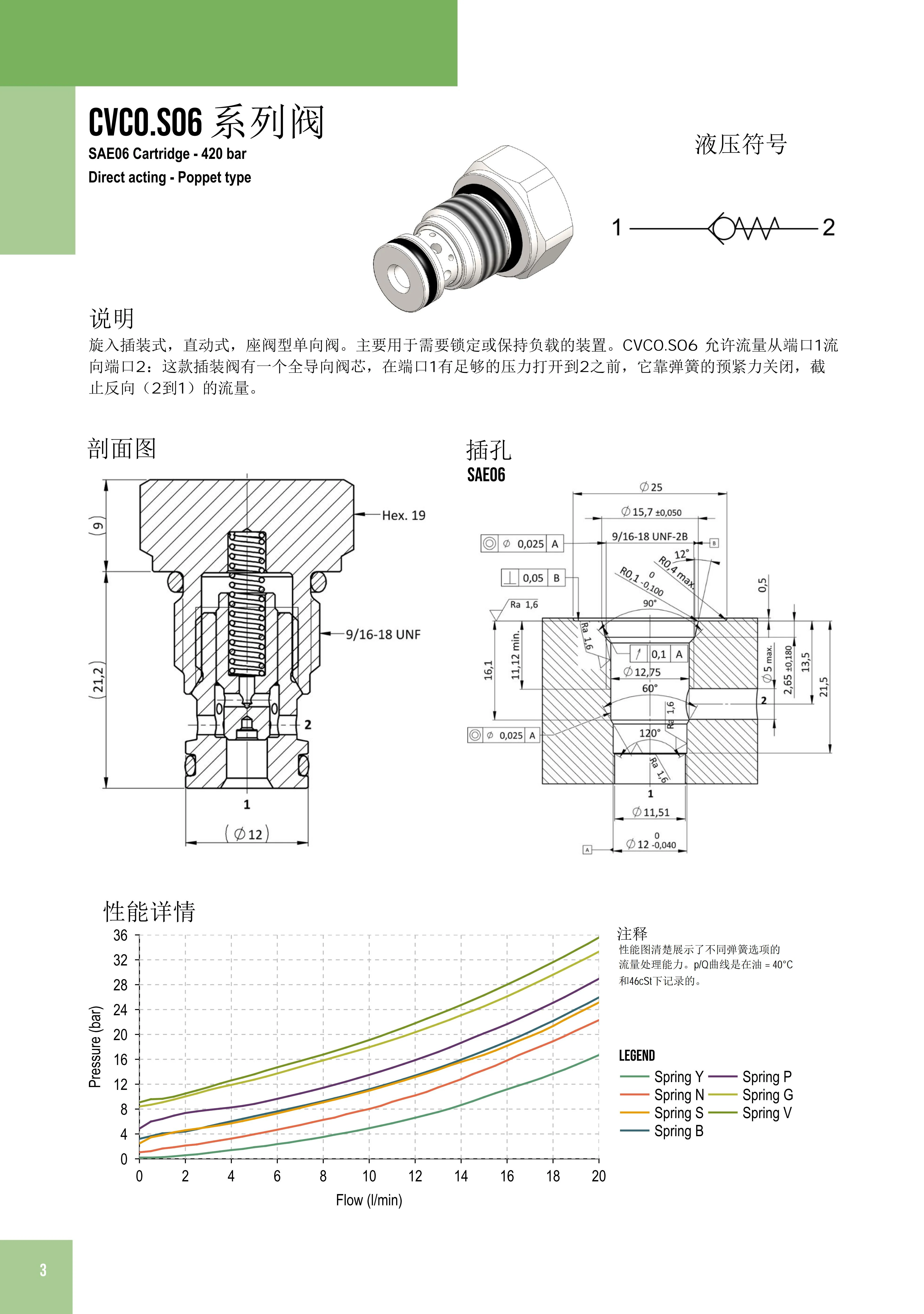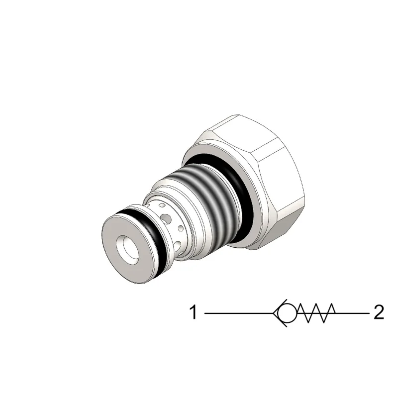 旋入插裝,直動式,座閥型單向閥。主要用于需要鎖定或保持負載的裝置。CVC0.S06 允許流量從端口1流向端口2:這款插裝閥有一個全導向閥芯,在端口1有足夠的壓力打開到2之前,它靠彈簧的預緊力關閉,截止反向(2到1)的流量。